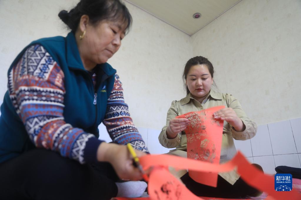 2月20日,在遼寧省朝陽市朝陽縣木頭城子鎮(zhèn)十家子村,王穎(右)在一戶村民家中和村民一起剪紙。