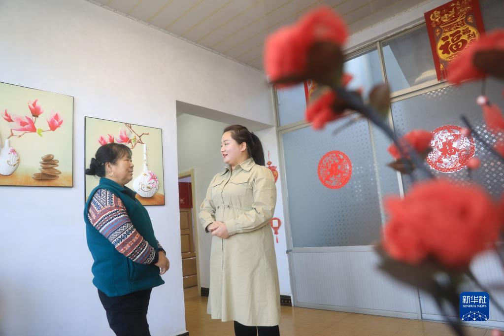 2月20日,在遼寧省朝陽市朝陽縣木頭城子鎮十家子村,王穎(右)在村民家中和村民嘮家常。