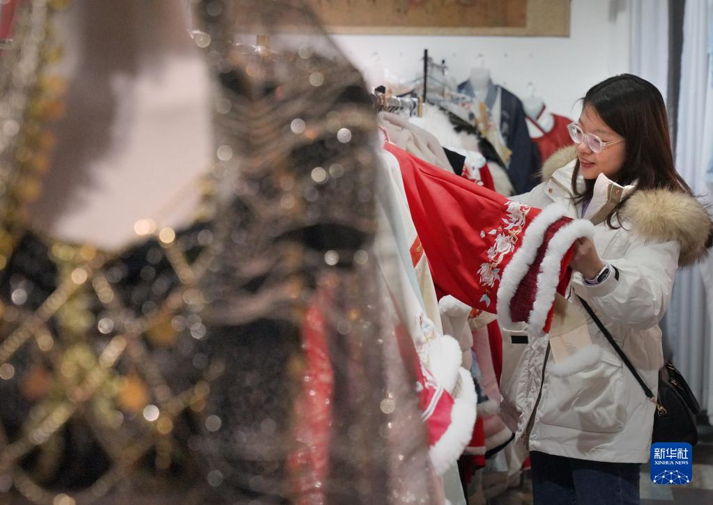 游客在洛陽市洛邑古城的傳統服飾店內挑選服裝(2月22日攝)。
