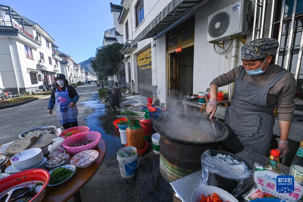 2月26日,蓮花鎮戴家新村的村民在新居門前烹飪農家菜,為百家宴做準備。