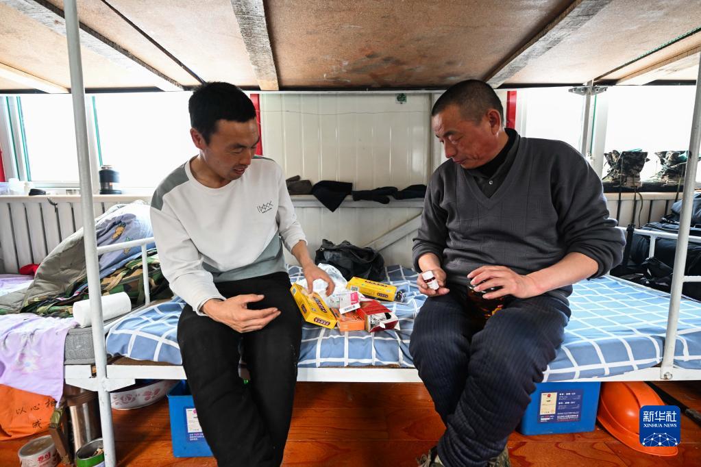 2月22日,烏龍岱林場402工隊職工溫樹昌(左)和工友何建山在駐點的移動板房內整理藥品。