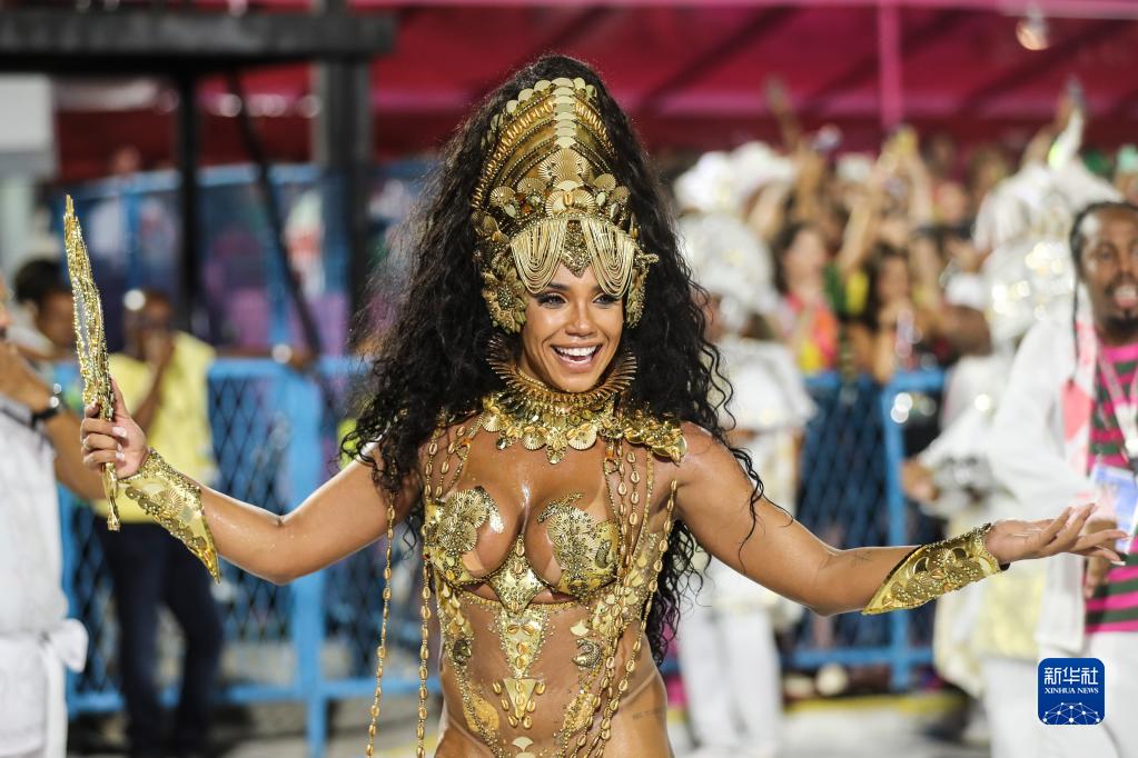 2月25日,在巴西里約熱內(nèi)盧桑巴大道,一名桑巴舞校的演員參加狂歡節(jié)游行。