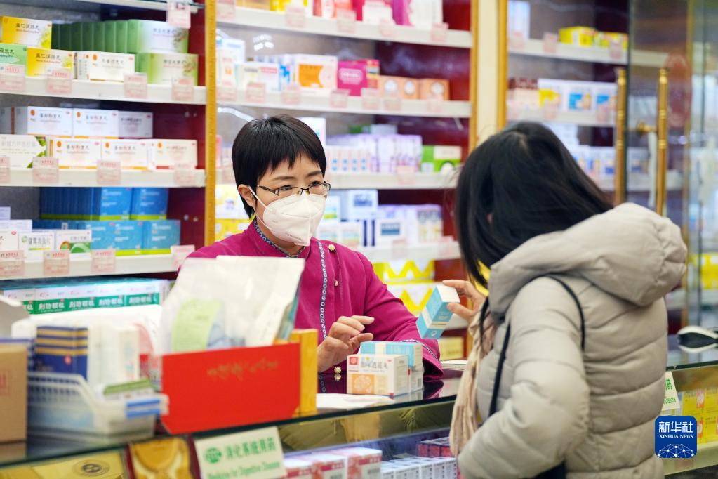 在白塔寺藥店內(nèi),張海鷗(左)為一位咨詢購藥的顧客講解幾種藥物的使用注意事項(2月22日攝)。