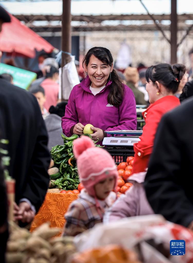 2月26日,在托克扎克鎮農貿市場,蔬菜商販和顧客交流。