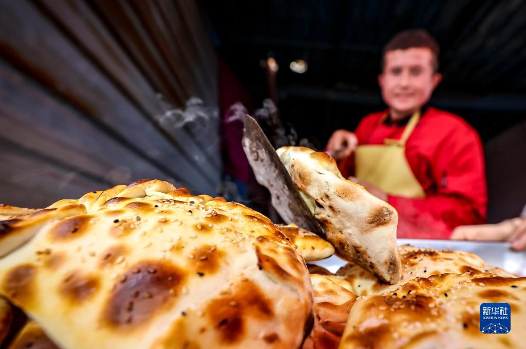 2月26日,在托克扎克鎮農貿市場,名為“庫麥其”的當地傳統面食剛剛出爐。