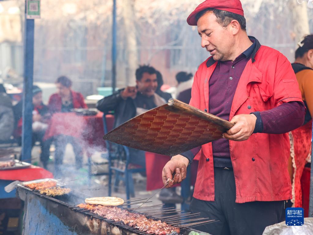 2月26日,在托克扎克鎮農貿市場的一處燒烤攤,攤主在烤制肉串。