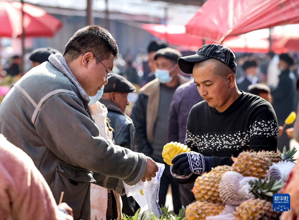 2月26日,在托克扎克鎮農貿市場,顧客在購買菠蘿。
