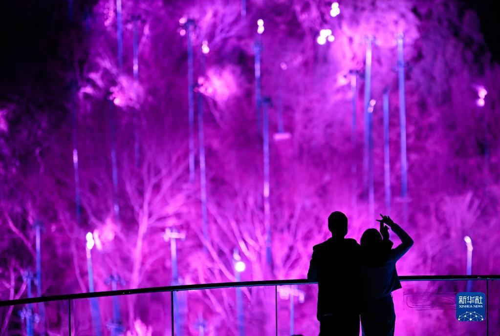 當地群眾在眉山市仁壽縣打造的“兩山一河”亮化工程觀光游覽(2月25日攝)。