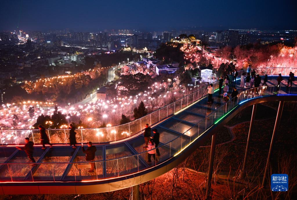 當地群眾在眉山市仁壽縣打造的“兩山一河”亮化工程觀光游覽(2月25日攝)。