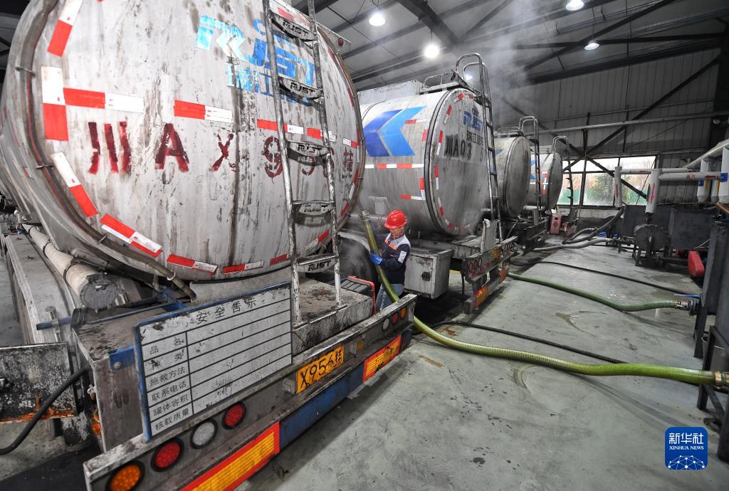 2月21日,四川一家環保科技有限公司員工將油罐車運來的餐廚廢油轉送至生產線。