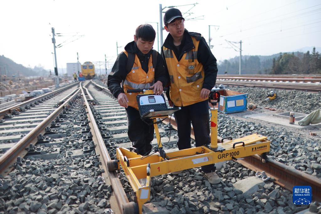 2月27日,在貴南高鐵都勻東站附近,貴陽(yáng)高鐵工務(wù)段的技術(shù)人員使用測(cè)量小車對(duì)鋼軌進(jìn)行檢測(cè)。