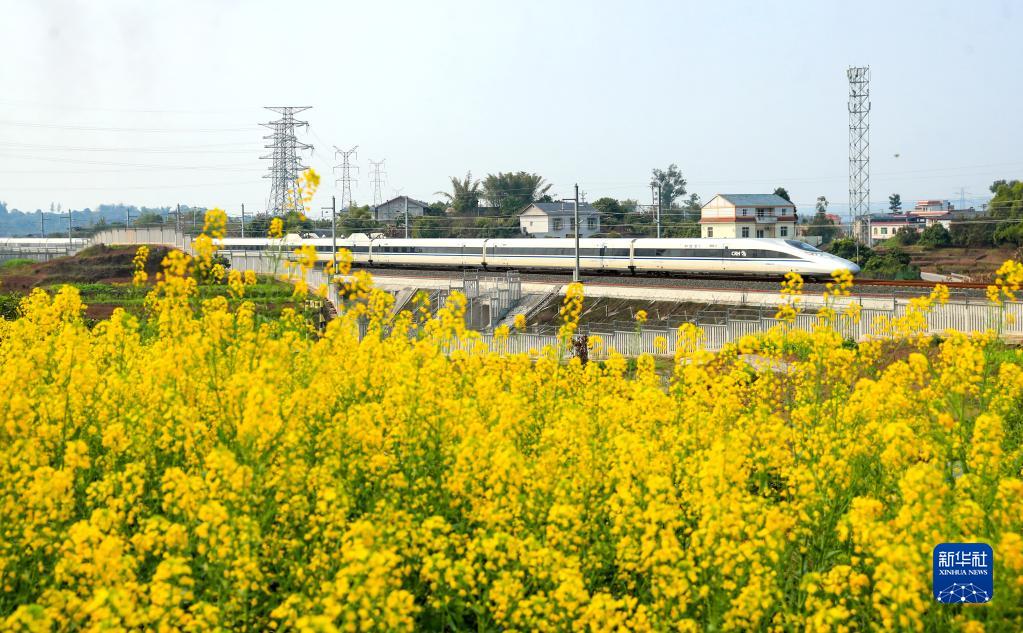 春暖花開時節(jié),油菜花陸續(xù)盛開,列車穿行其間,美不勝收。