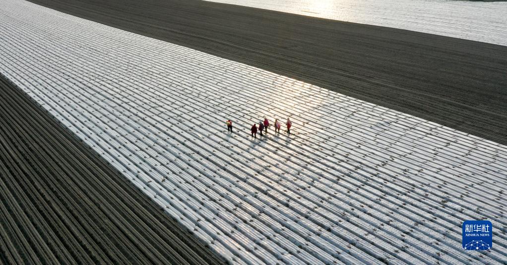 2月26日,四川省南充市蓬安縣錦屏鎮中壩社區的農民在蔬菜種植基地勞作(無人機照片)。