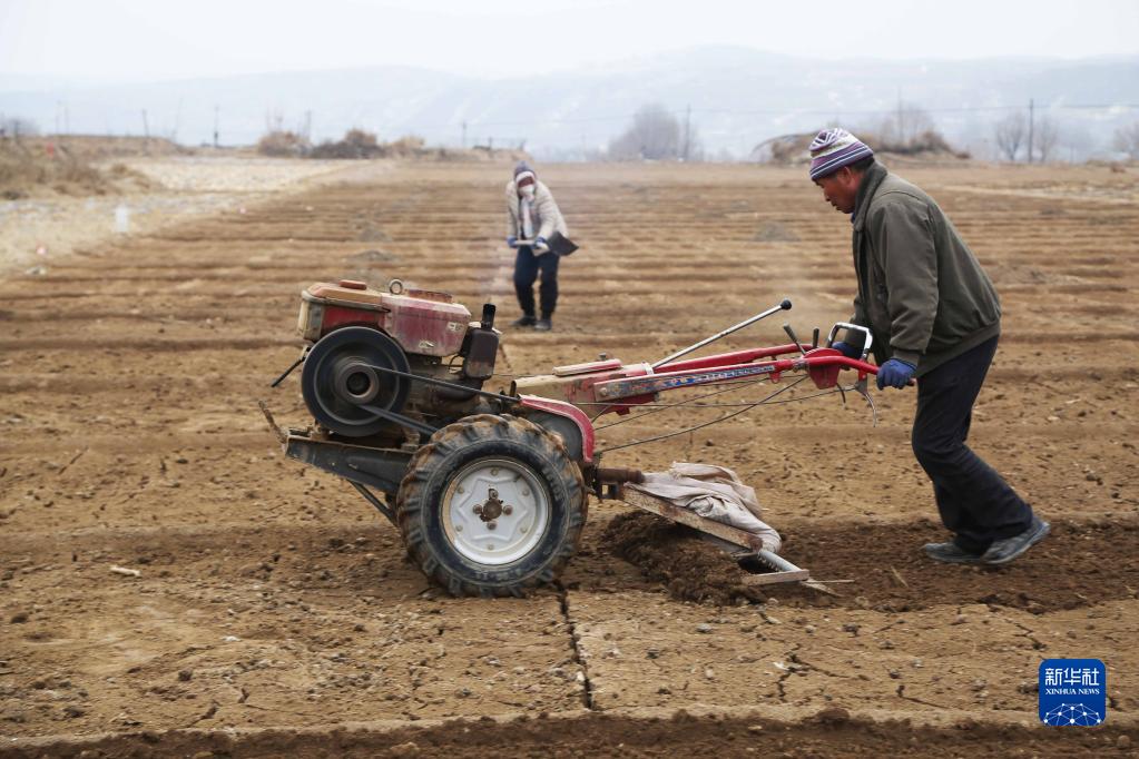 2月27日,甘肅省定西市安定區內官營鎮農民在平整土地。