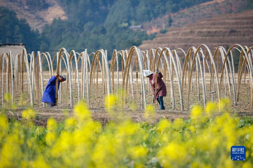 2月27日,瓜農(nóng)在貴州省黔東南苗族侗族自治州丹寨縣興仁鎮(zhèn)城江村西瓜田間搭建瓜棚。