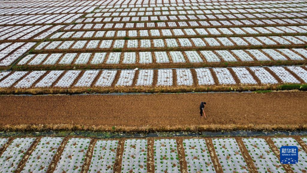 2月28日,菜農在云南省曲靖市沾益區西平街道的蔬菜種植基地平整菜地(無人機照片)。