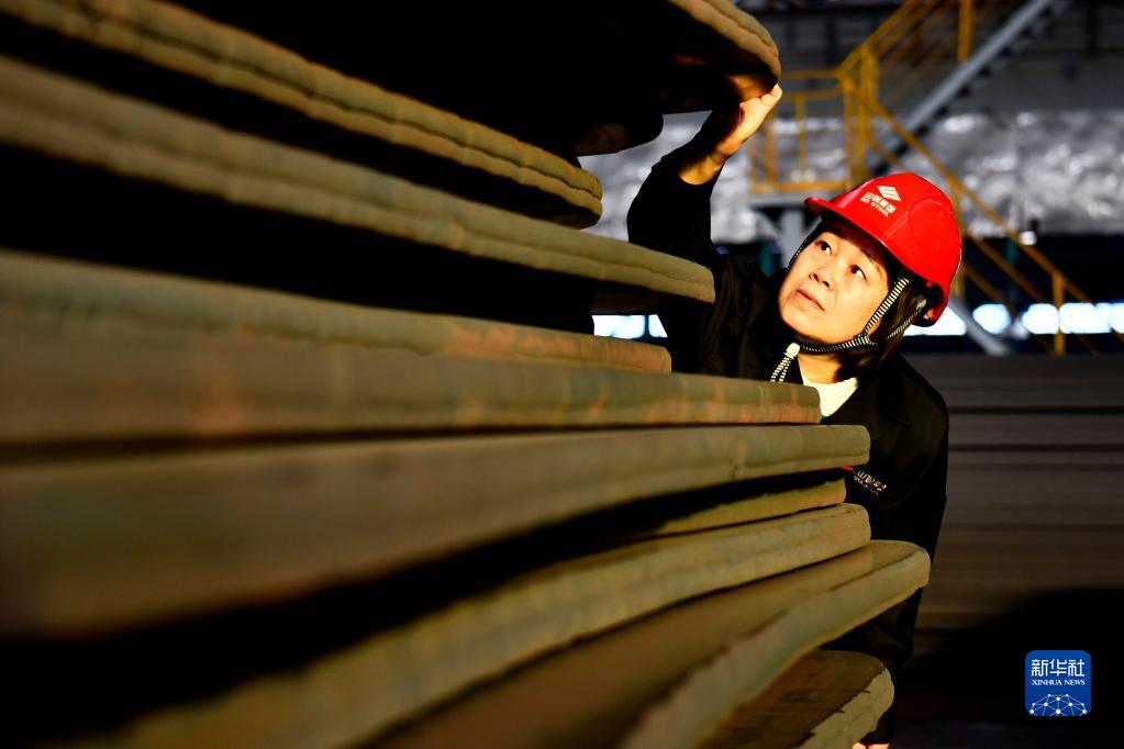 在山鋼集團日照公司生產車間,胡淑娥在查看鋼板質量情況(2月16日攝)。