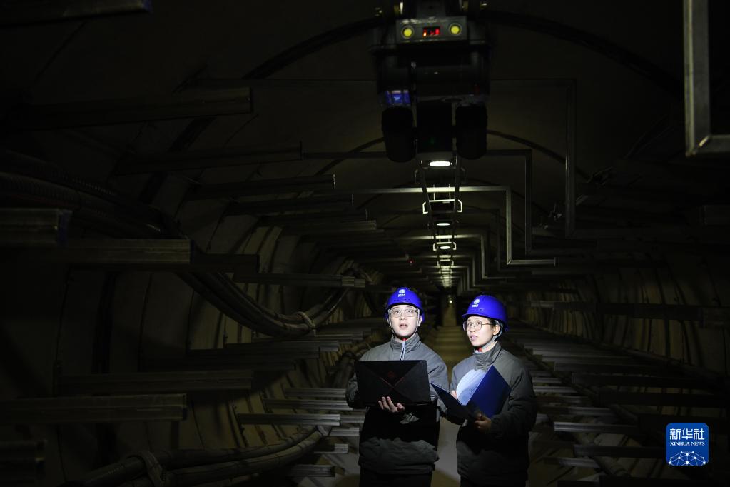 2月27日,國網合肥供電公司電纜運檢中心工作人員在巢湖湖底電纜隧道內調試“機器人巡檢員”。