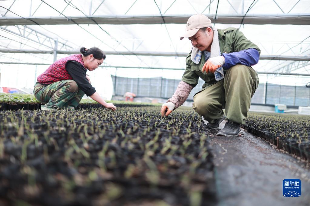 2月28日,當地農民在大棚內對羅漢果苗進行管理。