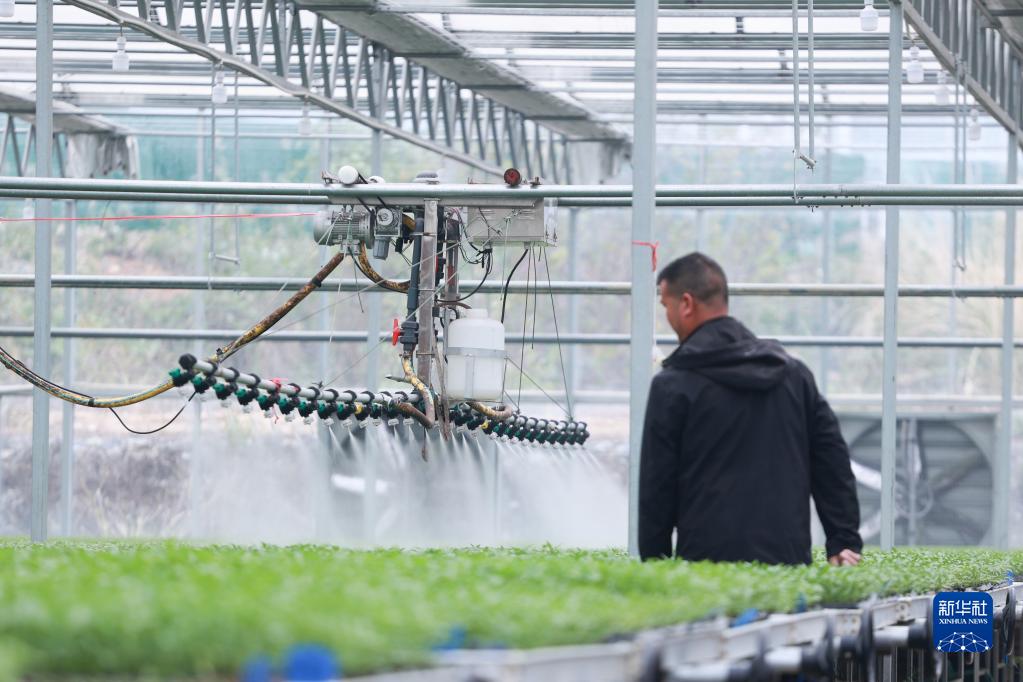在貴州省榕江縣車江壩區智慧育苗中心內,當地農民運用水稻缽體育秧機、水肥一體自動噴淋機、多功能育苗大棚等機械化、智能化設備進行育秧育苗生產,有效提高了勞動效率和種苗質量,助力春耕生產。