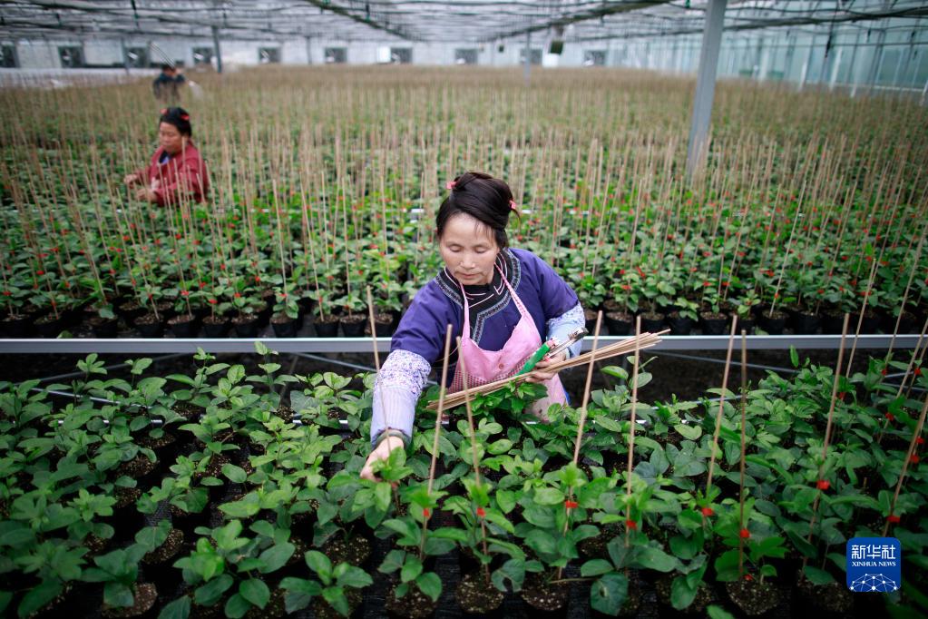 2月28日,一名少數(shù)民族婦女在大棚內(nèi)對(duì)百香果苗進(jìn)行管理。