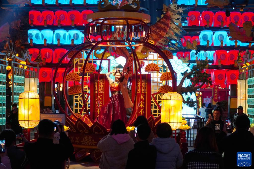 2月27日晚,游客在位于山東省東平縣的大宋不夜城觀看表演。