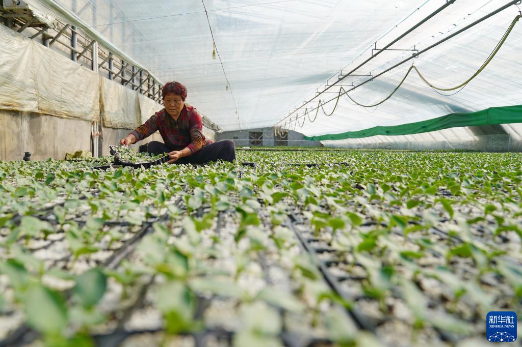 2月28日,河北省巨鹿縣觀寨鎮(zhèn)南哈口村村民在育苗棚內打理秧苗。