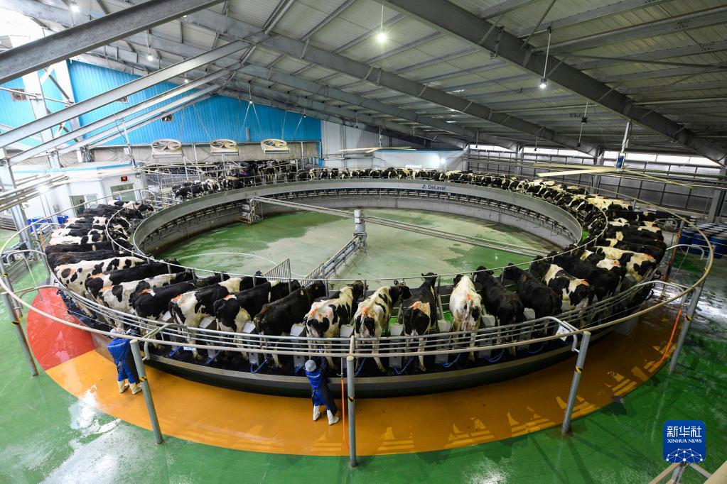這是2月28日在豐寧縣魚兒山鎮一家智能牧場拍攝的轉盤式擠奶廳。