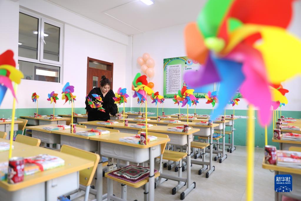 2月28日,遼寧省臺安縣逸夫小學班主任婁寵麗在班級里布置教室。