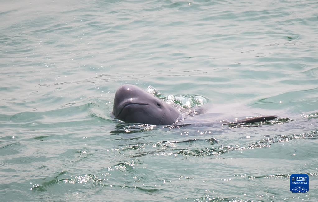 在湖北省宜昌市,長江江豚在水中嬉戲(2021年5月11日攝)。