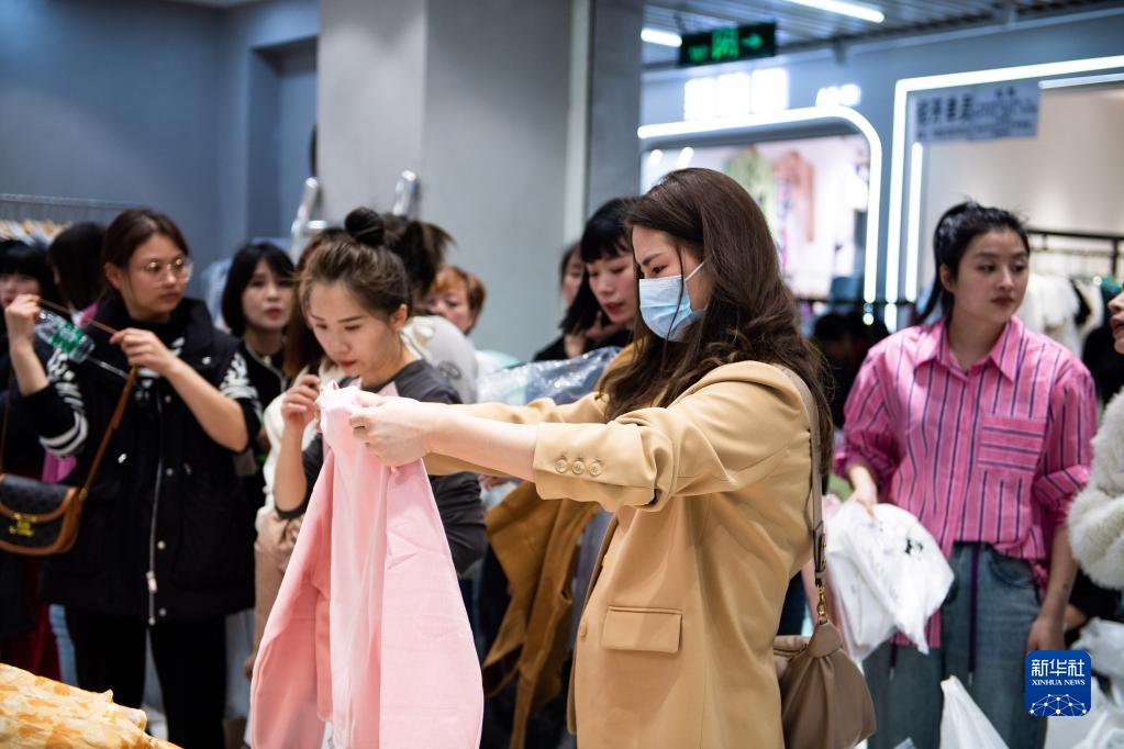 2月28日,批發商在湖南省株洲市蘆淞區華麗服裝批發大市場選購服飾。