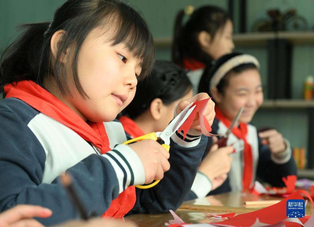 2月28日,學生在石家莊市東風小學非遺工坊學習剪紙。