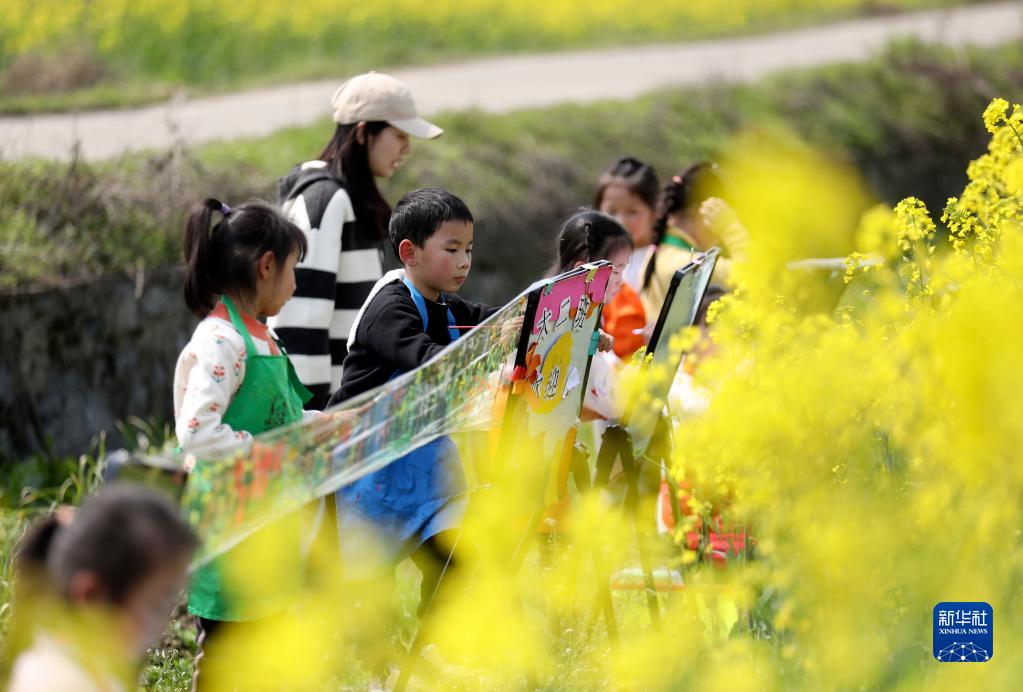 2月28日,在湖南省資興市唐洞街道高碼村,小朋友在油菜花田旁畫畫。