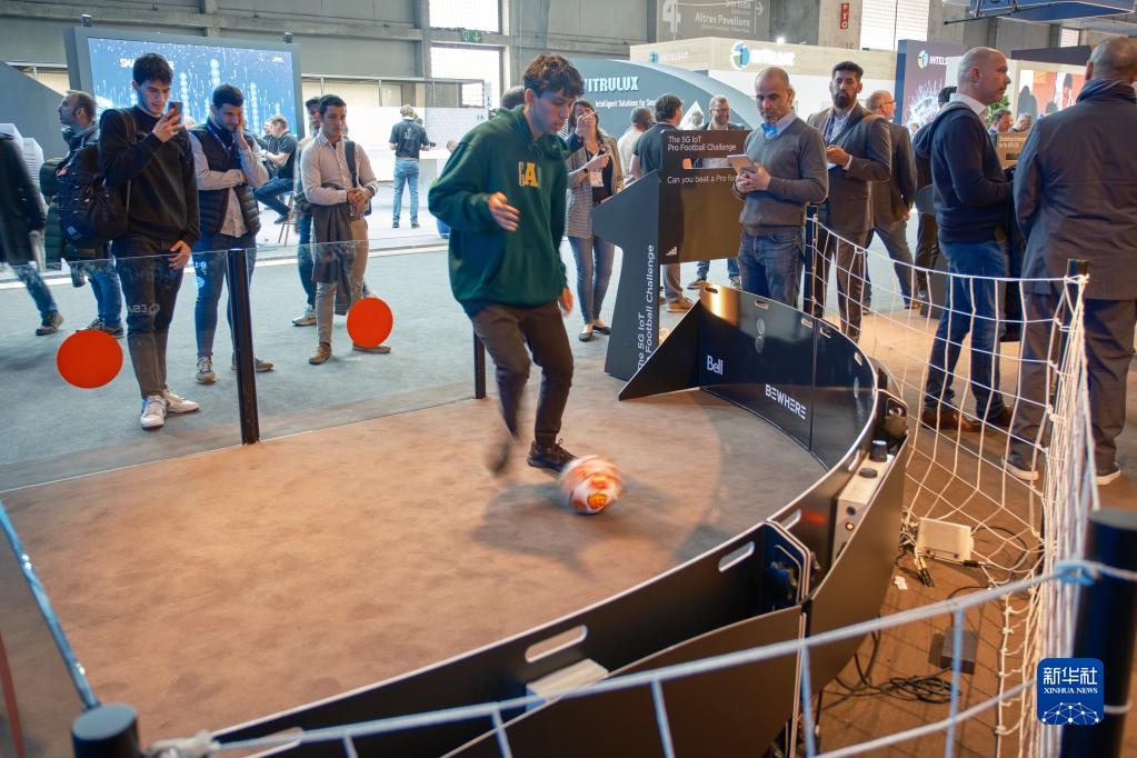 2月28日,一名男子在西班牙巴塞羅那舉行的2023世界移動通信大會上體驗智能足球測試設備。