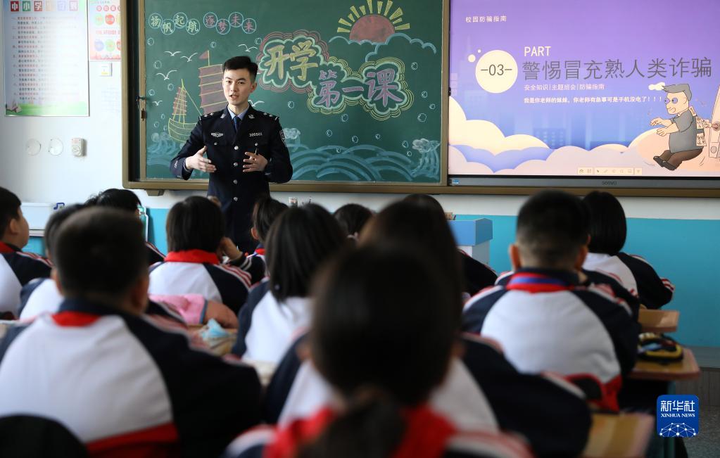 3月1日,一名鞍山市臺安縣公安局民警來到臺安縣實驗學校為學生講授安全教育課。