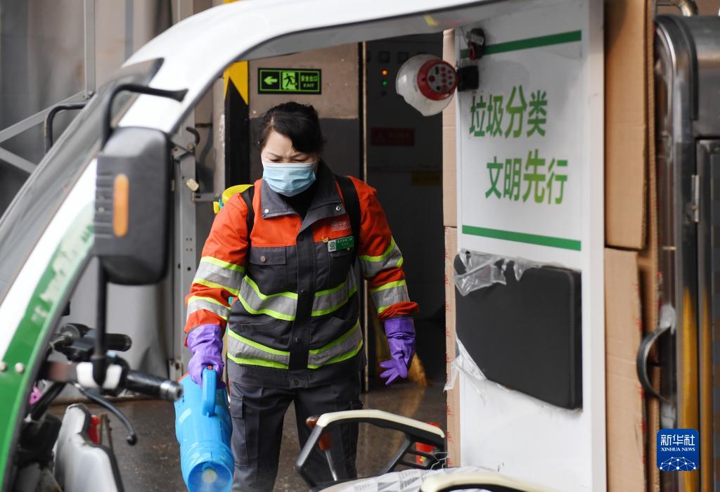 2月17日,劉明群給垃圾清潔站內正在傾倒垃圾的車輛消毒。