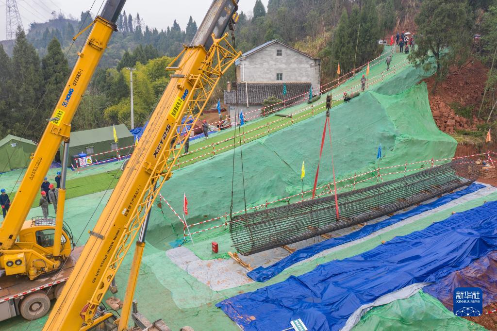3月1日,在重慶市潼南區小渡鎮川渝1000千伏特高壓交流工程(重慶段)施工現場,工作人員操作吊車起吊鋼筋籠。