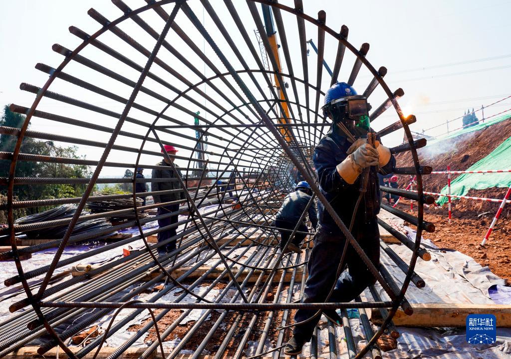 2月26日,重慶市潼南區(qū)小渡鎮(zhèn)川渝1000千伏特高壓交流工程(重慶段)施工現(xiàn)場,工人在進(jìn)行焊接作業(yè)。