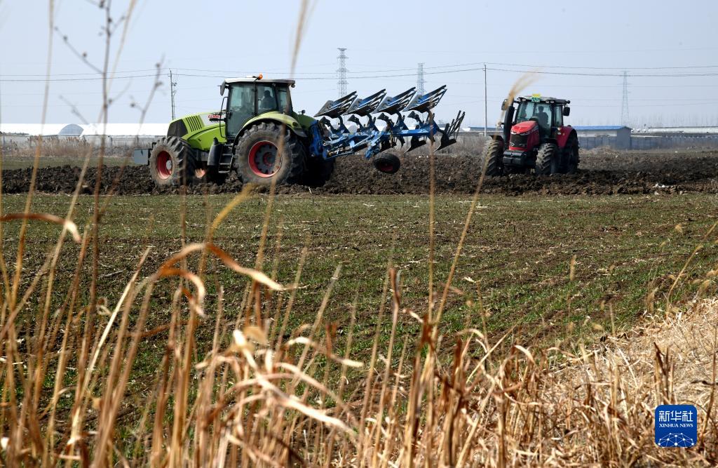 在萊西市夏格莊鎮(zhèn)曲家泊南村農(nóng)田里,安裝了北斗精準(zhǔn)定位輔助系統(tǒng)的拖拉機在進行田間作業(yè)(2月28日攝)。