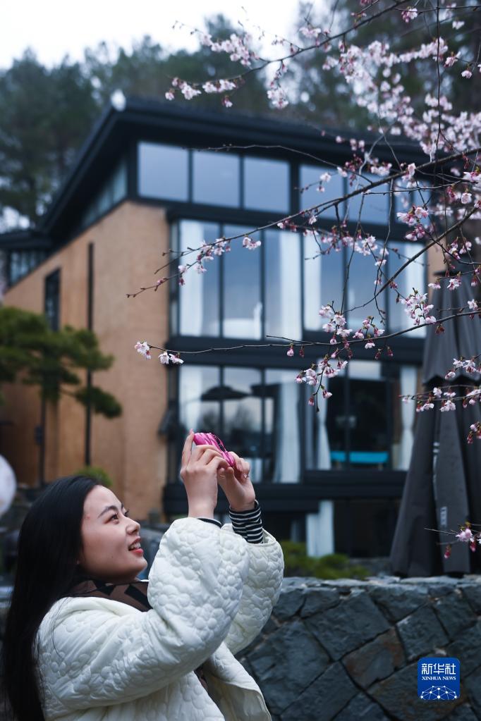 2月28日,游客在三都鎮前源村山頂的一家民宿觀賞櫻花。