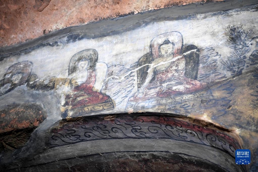 這是寧夏須彌山石窟圓光寺48號窟內完成修復的壁畫(2月28日攝)。