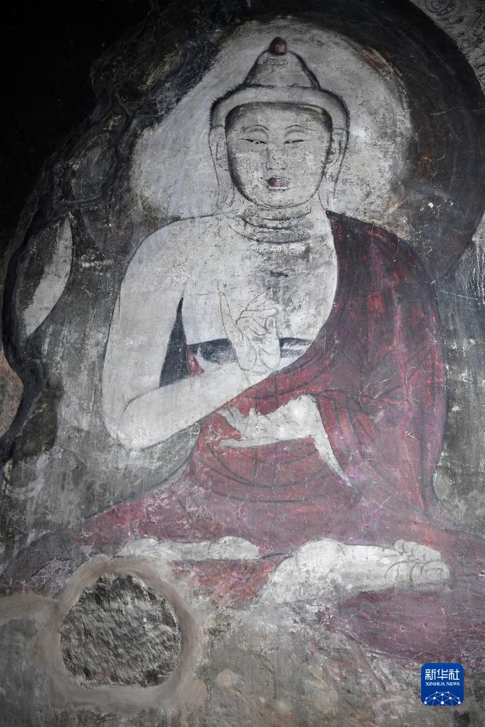 這是寧夏須彌山石窟圓光寺48號(hào)窟內(nèi)完成修復(fù)的壁畫(huà)(2月28日攝)。