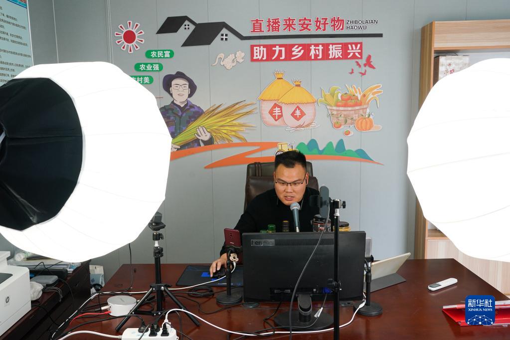 2月28日,王昌在來安縣水口鎮擁巷村的直播間里直播推介鄉村農產品。