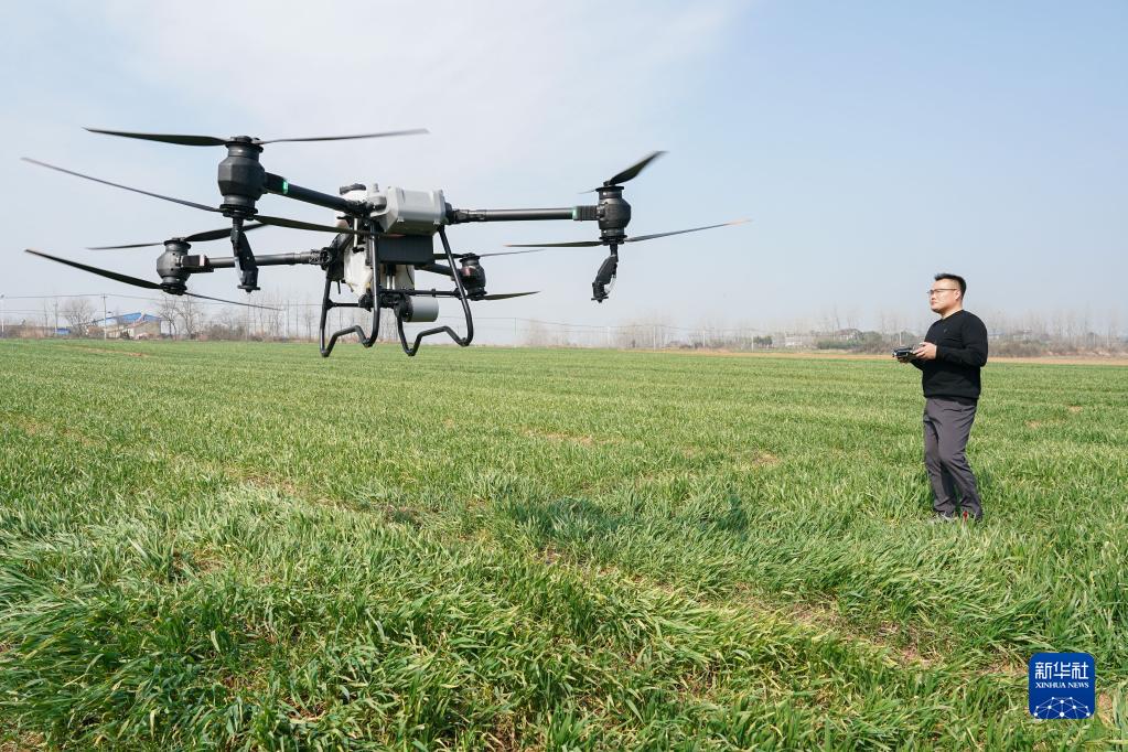2月28日,王昌在來安縣水口鎮擁巷村操作植保無人機噴灑除草劑。