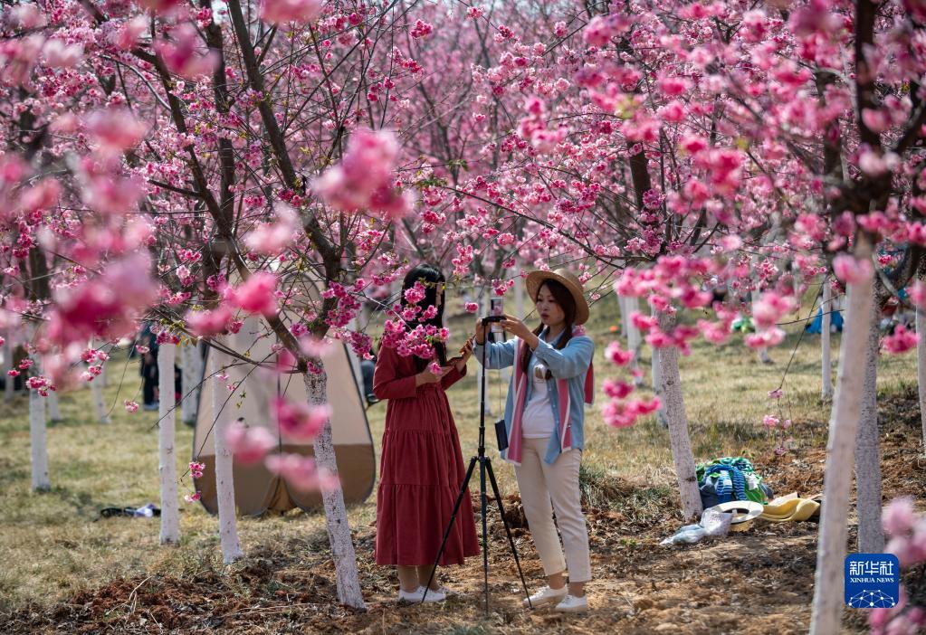 3月1日,兩名游客在宜良縣山后櫻花谷觀光直播。
