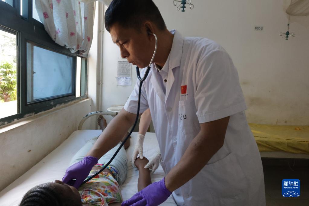 2月27日,在位于塞拉利昂首都弗里敦市郊的塞拉利昂-中國友好醫院,一名中國醫療隊醫生為患者檢查身體。