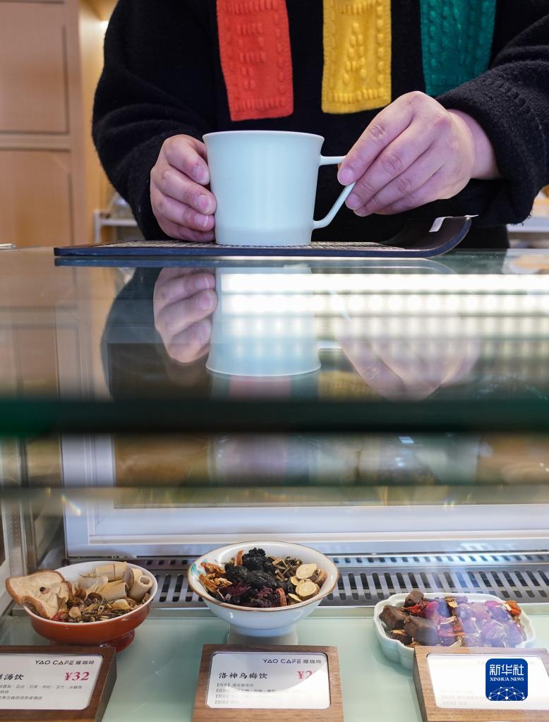 在位于北京西城區的老字號白塔寺藥店內的“耀咖啡”,柜臺中展示著制作特色飲品的中藥材(2月22日攝)。