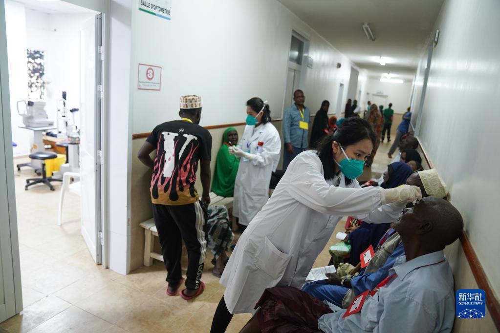 2月28日,在吉布提首都吉布提市貝爾蒂醫(yī)院,醫(yī)療隊(duì)隊(duì)員正在為白內(nèi)障患者進(jìn)行術(shù)前檢查。