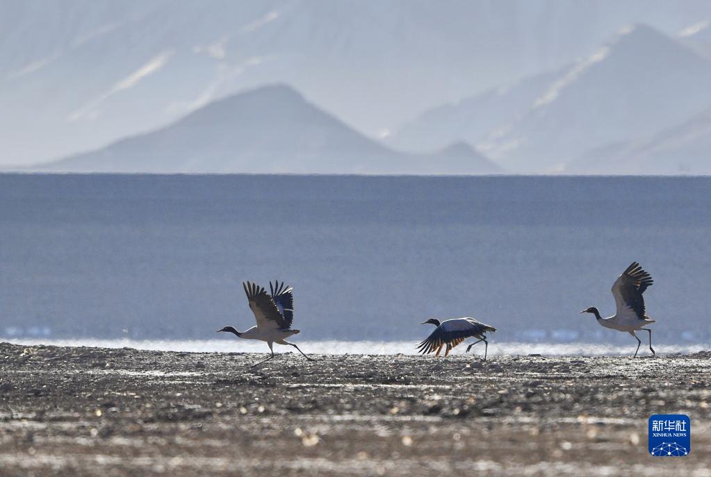 這是在拉薩市林周縣虎頭山水庫拍攝的黑頸鶴(3月1日攝)。