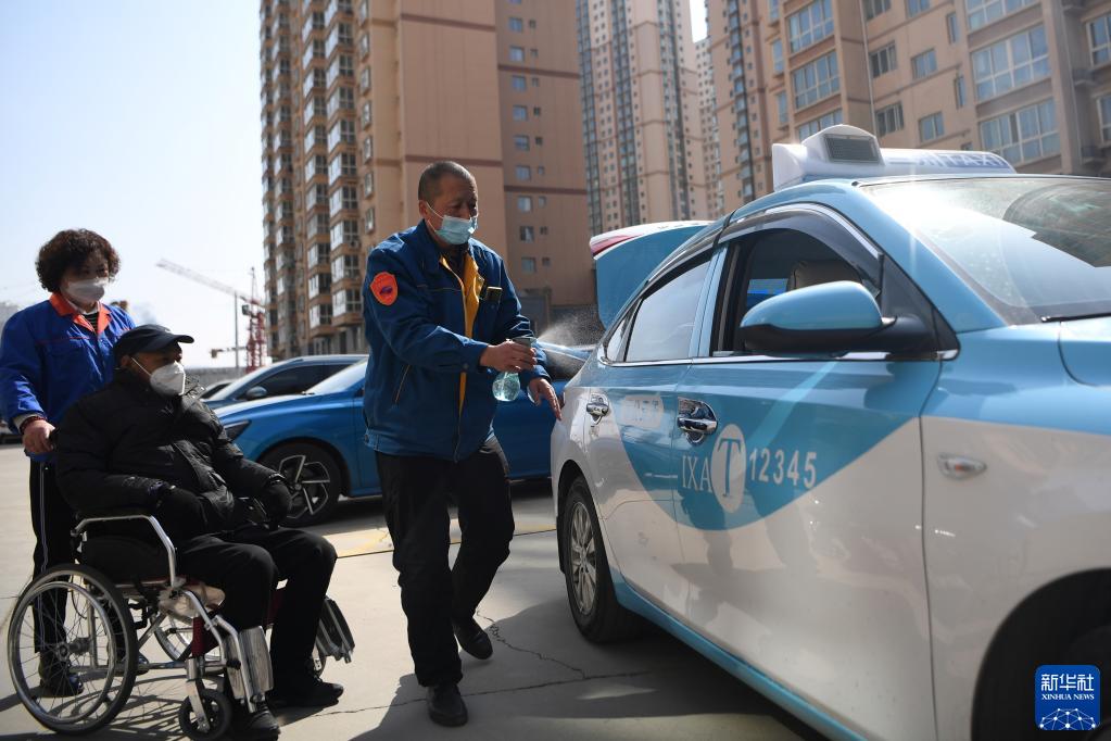 強漢紅(右一)在老人上車前給車輛消毒(3月1日攝)。